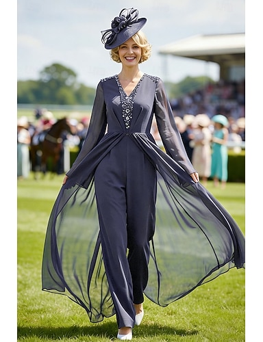 Tute Lunghezza al pavimento Abito Derby Abito da cerimonia per signora Manica Lunga Scollo a V Elegante Vintage Derby del Kentucky Chiffon con Perline