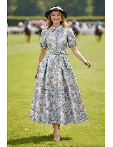 Linea ad A Lunghezza Tè Abiti da Cocktail Elegante Vintage Floreale Manica Corta Colletto a Camicia Festa in giardino Matrimonio Tasca Jacquard con Fiocco/Fiocchi Tasca