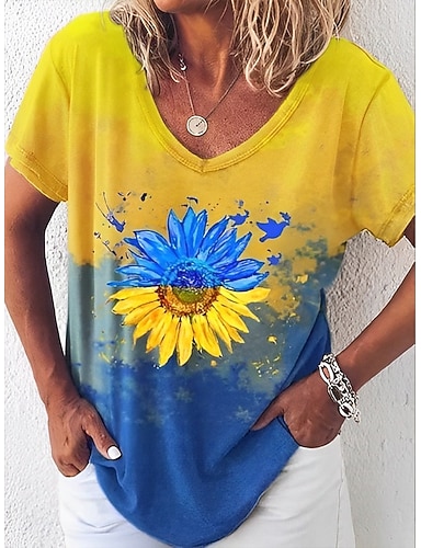 Per donna Maglietta Blocco di colore Stampato Floreale Grafico Vintage Elegante Classico Manica Corta Scollo a V Top Regolari Quotidiano Blu Giallo Estate Primavera
