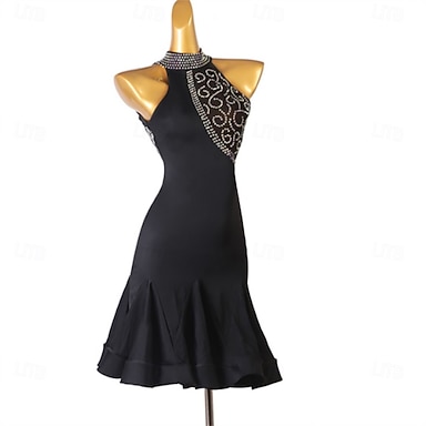 abito da ballo latino nero da donna con decorazioni in strass, scollo all'americana e gonna svasata, ideale per salsa, tango e abbigliamento da spettacolo