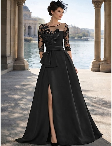 Linea ad A Strascico da Corte Abito da invitata a nozze Abito Formale Abito svasato Abito da cerimonia per signora Manica 3/4 Collo gioiello Abito Nero Spacco Alto Ospite di nozze Autunno Raso con