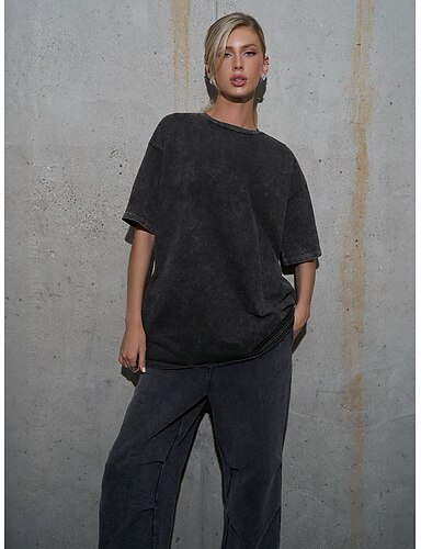 T-Shirt da donna in cotone 100% vintage lavata a tinta unita stilosa classica casual a maniche corte girocollo collo rotondo tops regolari quotidiane sport uscita Blu Verde erba Nero Verde militare