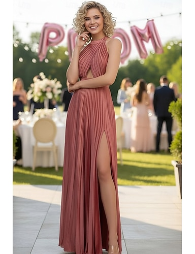 Linea ad A Lunghezza al pavimento Abiti da Ballo Elegante Spacco laterale Senza Maniche All'americana Balli di fine anno Formale Raso con Pieghe