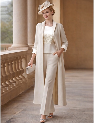 Due Pezzi Tuta Completo Pantalone Lunghezza al pavimento Abito da cerimonia per signora Manica 3/4 Scollo a V Elegante Staccabile Formale Ospite di nozze Raso con Perle