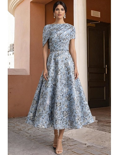 Linea ad A Lunghezza Tè Abiti da Cocktail Abiti per invitati a matrimoni Elegante Manica Corta Scollo a Barca Festa in giardino Formale Jacquard con Stampa floreale Stampa