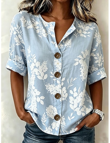 Per donna Camicia Stampato Floreale Grafico Elegante Vintage Casual Mezza Manica Scollo a V Top Regolari Casuale Quotidiano Ferie Blu Bianco Beige Estate Primavera