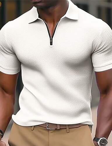 Per uomo Polo a nido d'ape Polo con zip Esterno Sport Bavero Chiusura lampo quarto Manica corta Di tendenza Moderno Liscio Cerniera Estate Standard Bianco Polo a nido d'ape