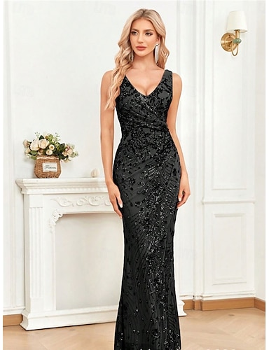 Abiti da quindici anni a sirena tromba abito elegante abito formale da matrimonio lungo fino al pavimento senza maniche scollo a V paillettes schiena a V con spacco in paillettes