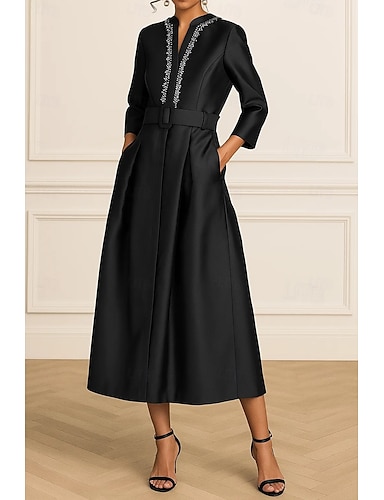 Linea ad A Lunghezza Tè Abiti da Cocktail Elegante Quotidiano Manica 3/4 Scollo a V Festa in giardino Matrimonio Raso Raso Elasticizzato con Cristalli