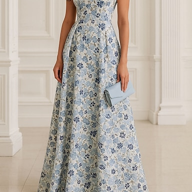 Linea ad A Lunghezza al pavimento Abito da Sera Elegante Vintage Manica Corta Senza Spalle Matrimonio Formale Jacquard con Stampa floreale Tasca