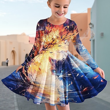 ragazze' 3D Pop art Animali Gatto Vestito Manica lunga Estate Primavera Da mare Giornaliero Per eventi Da principessa Bellissimo Dolce Bambino 4-12 anni Abito casual Abito linea A Al ginocchio