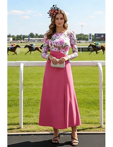 Tubino Colonna Lunghezza alla caviglia Abiti da Cocktail Abiti da festa Elegante Madre della sposa Manica Lunga Colletto a Camicia Matrimonio Formale Nylon con Stampa floreale