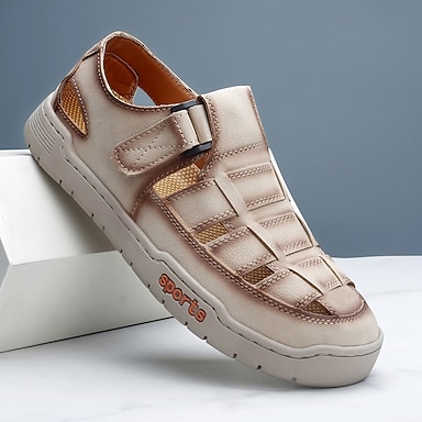 Sandali da pescatore da uomo beige, scarpe casual a punta chiusa con cinturino regolabile, ideali per camminare, viaggiare, tempo libero all'aperto, weekend fuori porta, comfort estivo quotidiano e look smart casual.
