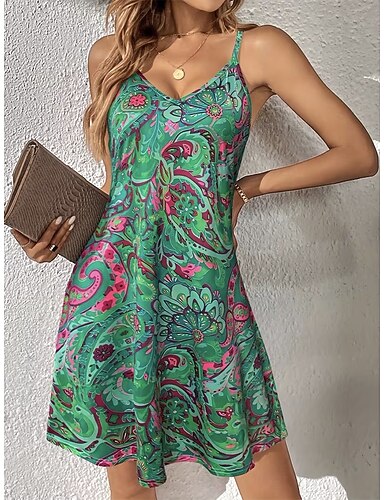 Per donna Abito Midi Abito Boho Vestito Estivo Elegante Bohemien Vacanza Spiaggia Ferie Vestibilità regolare Grafico Foglia Senza Maniche Scollo a V Blu Viola Beige Estate Primavera