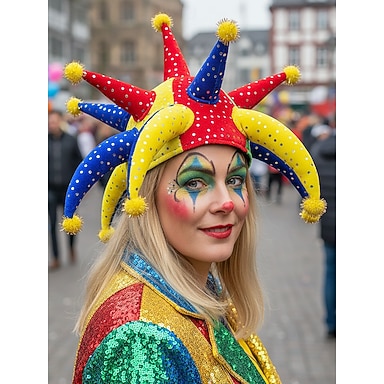 Cappello giullare multi-colore unisex per Mardi Gras con pompon e punti di paillettes - copricapo per clown di carnevale Mardi Gras e maschere