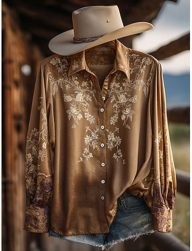 Per donna Camicia Blusa Patchwork Bottoni Stampato Floreale Grafico Vintage Casual Manica Lunga Colletto a Camicia Top Regolari Quotidiano Blu marino Marrone Estate Primavera Autunno Inverno