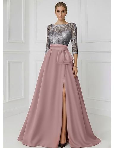 Linea ad A Lunghezza al pavimento Perline ricamate Abito Formale Abito da madre della sposa Abito da Sera Elegante Spacco Alto Manica 3/4 Girocollo Matrimonio Formale Raso Con Paillettes con