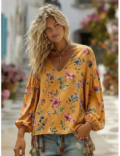 Per donna Camicia Camicia Boho Floreale Grafico Elegante Bohemien Vacanza Manica Lunga Scollo a V Top Regolari Casuale Quotidiano Ferie Blu Bianco Rosa Arancione Estate Primavera