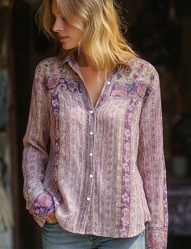 Per donna Camicia Camicia Boho Finto cotone e lino Bottoni Stampato Floreale Paisley Bohemien Attivo Casual Manica Lunga Colletto a Camicia Top Regolari Quotidiano Ferie Viola Primavera Autunno