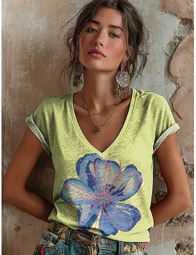 Per donna Maglietta Stampato Floreale Grafico Graffiti Bohemien Vintage Casual Manica Corta Scollo a V Top Regolari Quotidiano Blu Viola Arancione Verde Estate Primavera