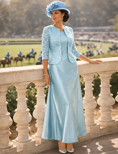 Tubino Colonna Lunghezza al pavimento Abito da invitata a nozze Abito da cerimonia per signora Manica 3/4 Scollo Tondo Elegante Ospite di nozze Abiti Corti con Giacca con Pizzo