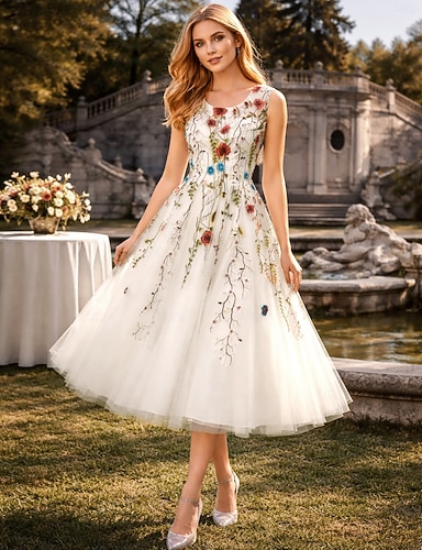 Linea ad A Lunghezza Tè Abiti da Ballo Elegante Floreale Senza Maniche Monospalla Festa in giardino Formale Tulle Senza schiena con Fiori 3D Arricciato