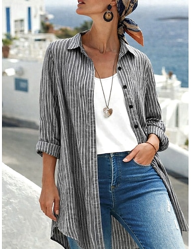 Per donna Blusa Bottoni Stampato A righe Vintage Elegante Casual Manica Lunga Colletto a Camicia Top lunghi Quotidiano Nero Estate Primavera Autunno