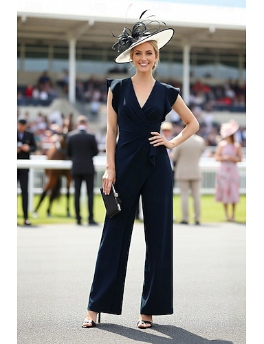Tuta Completo Pantalone Lunghezza alla caviglia Abito Derby Abito da cerimonia per signora Senza Maniche Scollo a V Elegante Derby del Kentucky Tessuto Elasticizzato con Volant A balze Arricciatura