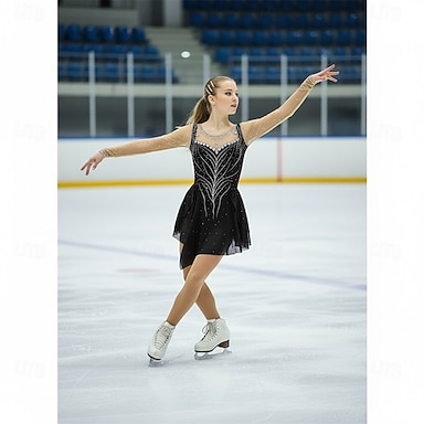 Abito da pattinaggio artistico Per donna Pattinaggio sul ghiaccio Vestito Nero Patchwork Foro per il pollice Elasticizzato Allenamento Competizione Vestiti da pattinaggio sul ghiaccio Classico