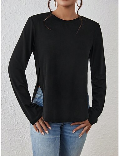 Per donna Maglietta Spacco laterale Tinta unica Elegante Classico Casual Manica Lunga Girocollo Top Regolari Quotidiano Uscire Nero Primavera Autunno Inverno
