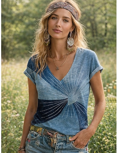 Per donna Maglietta Stampato Grafico Geometrico Bohemien Vintage Elegante Manica Corta Scollo a V Top Regolari Quotidiano Blu Estate Primavera