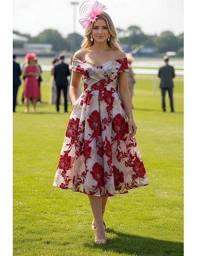 Linea ad A Lunghezza Tè Abito da cerimonia per signora Mezza Manica Scollo a V Elegante Vintage Formale Ospite di nozze Raso Jacquard con Fiocco/Fiocchi Nappa