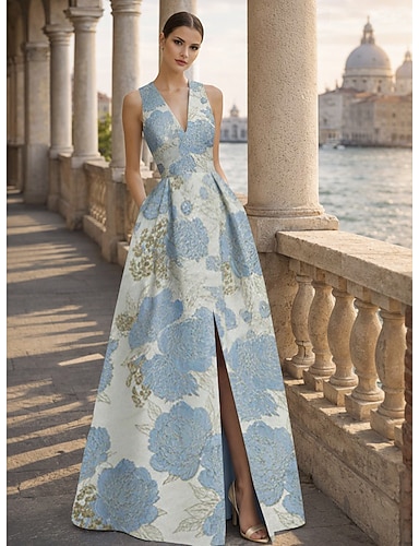 Linea ad A Lunghezza al pavimento Abito da Sera Da principessa Elegante Vintage Floreale Senza Maniche Scollo a V Matrimonio Formale Tasca Jacquard con Stampa floreale Pieghe Tasca