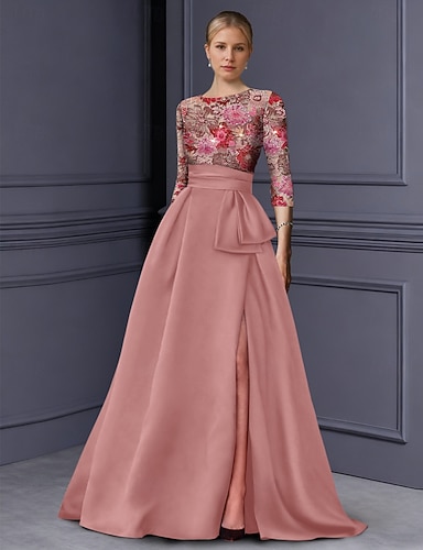 Linea ad A Lunghezza al pavimento Perline ricamate Abito Formale Abito da madre della sposa Abito da Sera Abito formale Elegante Brillanti Spacco Alto Manica 3/4 Girocollo Matrimonio Formale Mantelle