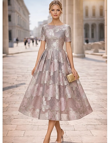 Linea ad A Lunghezza Tè Abiti da Cocktail Elegante Vintage Floreale Manica Corta Girocollo Festa in giardino Matrimonio Tasca Jacquard con Stampa floreale Ricamo