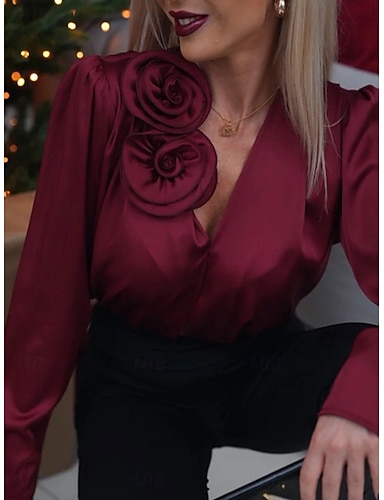 Natale Per donna Camicia in raso Camicia elegante Blusa Tinta unica Elegante Affari Manica Lunga Scollo a V Top Regolari Quotidiano Feste Bianco Vino Marrone Estate Primavera Autunno