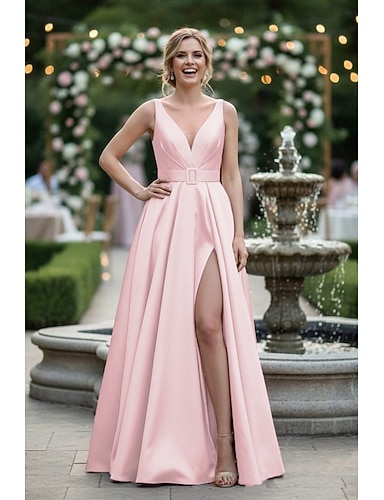 Linea ad A Lunghezza al pavimento Abito da invitata a nozze Abito Formale Abito da sera Abito da cerimonia per signora Senza Maniche Scollo a V Elegante Formale Ospite di nozze Raso con Fascia