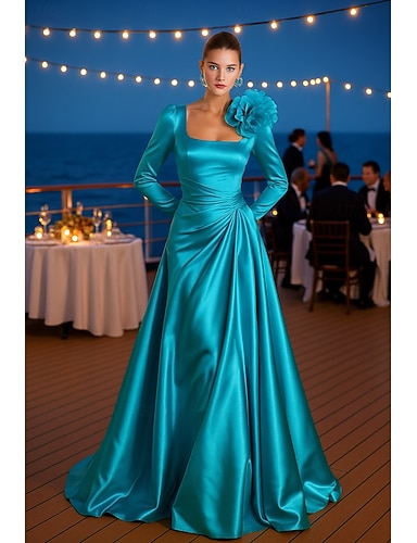 Linea ad A Lunghezza al pavimento Abito da Sera Da principessa Abito formale Elegante Setoso Manica Lunga Collo quadrato Matrimonio Formale Tasca Raso con Pieghe Tasca Fiore sulla Spalla