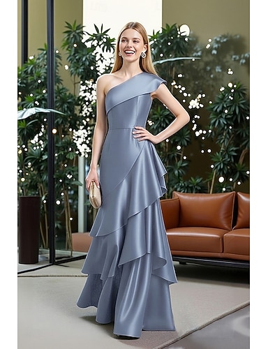 Linea ad A Lunghezza al pavimento Abito in Raso Abito da laurea Vestito da Festa Abito da cerimonia per signora Senza Maniche Monospalla Senza Spalle Elegante Cocktail Formale Ospite di nozze Raso con