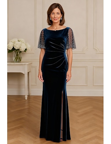 Tubino Colonna Lunghezza al pavimento Lunghezza Tè Abito in Velluto Abito Vintage Abito da invitata a nozze Abito da cerimonia per signora Manica Corta Girocollo Elegante Vintage Formale Ospite di