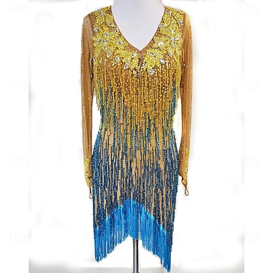 abito da ballo latino da donna in oro e blu con strass di cristallo e dettagli con frange per salsa, tango e spettacoli di danza