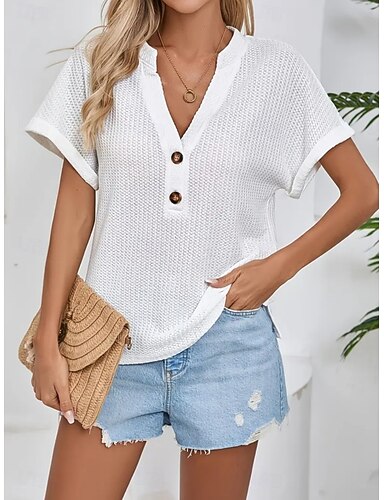 Per donna Blusa Bottoni Tinta unica Elegante Casual Manica Corta Scollo a V Top Regolari Quotidiano Bianco Vino Estate Primavera
