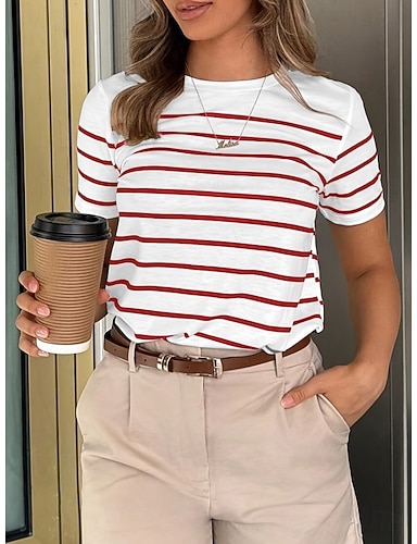 Per donna Maglietta Stampato Grafico Geometrico A righe Vintage Elegante Classico Manica Corta Girocollo Top Regolari Quotidiano Rosso Verde Estate Primavera