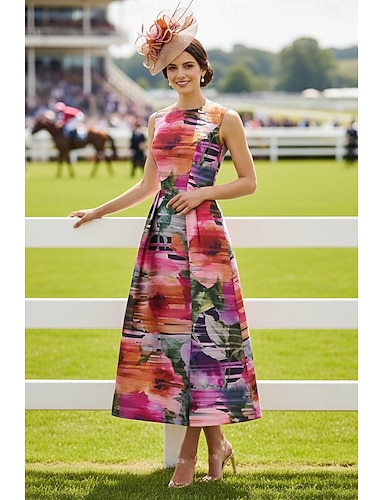 Linea ad A Lunghezza alla caviglia Abito da invitata a nozze Abito Derby Abito da cerimonia per signora Senza Maniche Girocollo Elegante Vintage Formale Derby del Kentucky Raso con Stampa