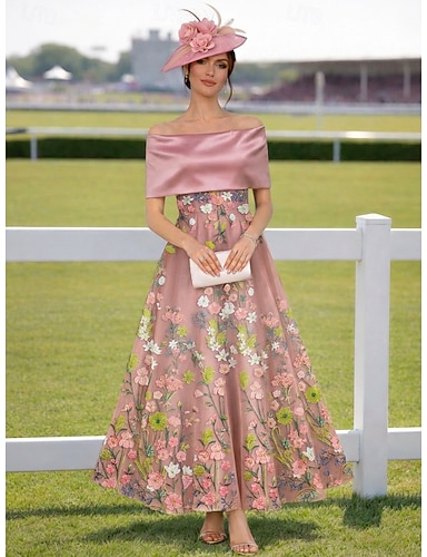Linea ad A Lunghezza alla caviglia Abiti da Cocktail Elegante Vintage Floreale Mezza Manica Senza Spalle Festa in giardino Matrimonio Raso Tulle Shiena scoperta con Fiore ricamato Pieghe Ricamo