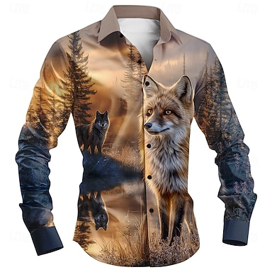 Per uomo Animale Lupo chiaro di luna Camicia Camicia con Bottoni Manica Lunga Vintage Retrò Casuale All'aperto Caccia Primavera Autunno Collo ripiegato Stampa 3D camicie con colletto Blu Blu chiaro
