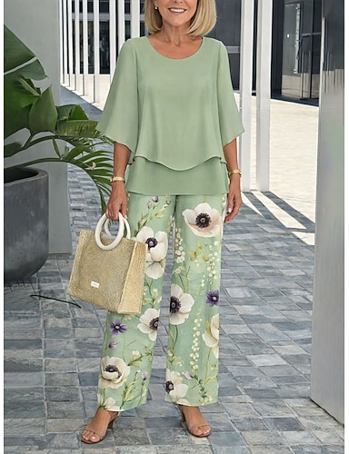 Set da donna 2 pezzi base neon e brillante camicia blusa a maniche 3/4 scollo a V stampa floreale casual in lino verde estate vestibilità regolare
