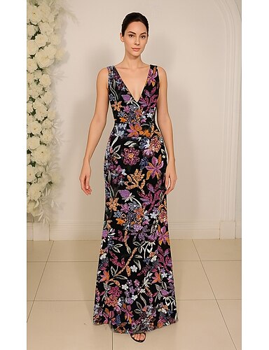 Linea ad A Tubino Colonna Lunghezza al pavimento Abito da Sera Abito da ballo con sopragonna Elegante Scintillante Floreale Senza Maniche Scollo a V Festa serale Matrimonio Raso con Stampa floreale