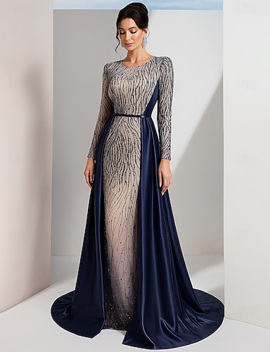 Abito per Ospite di Matrimonio A-Line Sheath Column Floor Length Abiti Formali Abito da Sera Abito Madre della Sposa Maniche Lunghe Collo a Giro Elegante Formale Ospite di Matrimonio con Perline