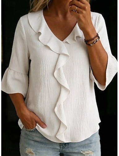 Per donna Blusa Finto cotone e lino Volant Tinta unica Elegante Casual Manica 3/4 Scollo a V Top Regolari Quotidiano Nero Bianco Rosa Rosso Verde Primavera Autunno